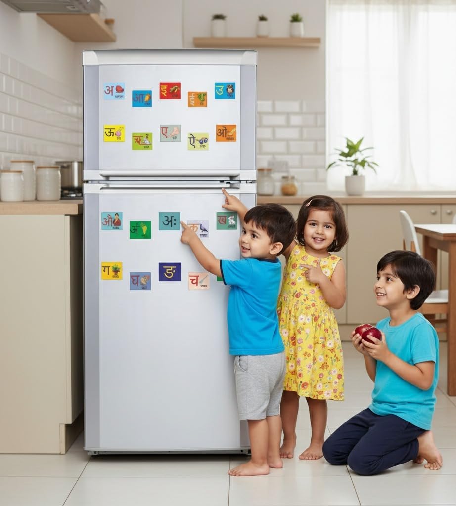 Gifts- Kids Hindi Alphabet Learning Fridge Magnets | Educational Varnamala Letters with Pictures | Magnetic Set for Kids Learning & Fun (Pack of 49) 4x5 cm