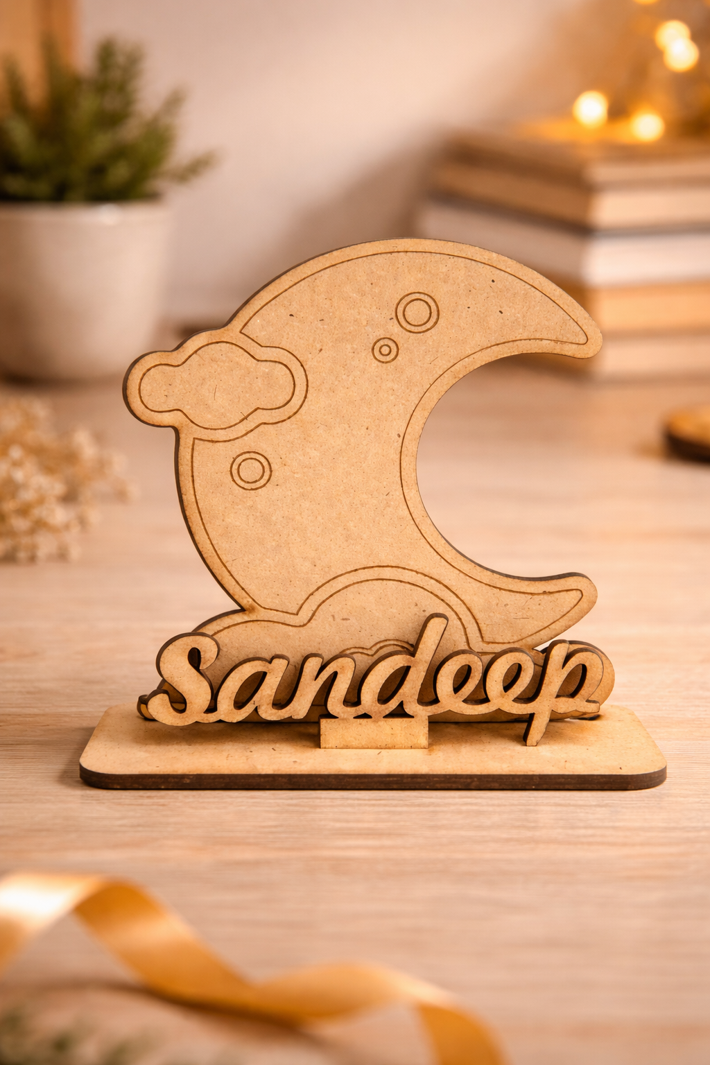 MDF Wooden Name Standee with Moon Design | Custom Name Desk Decor | Laser Cut Wooden Name Plate | Unique Gift for Kids, Birthday, Anniversary, Home & Office Decor