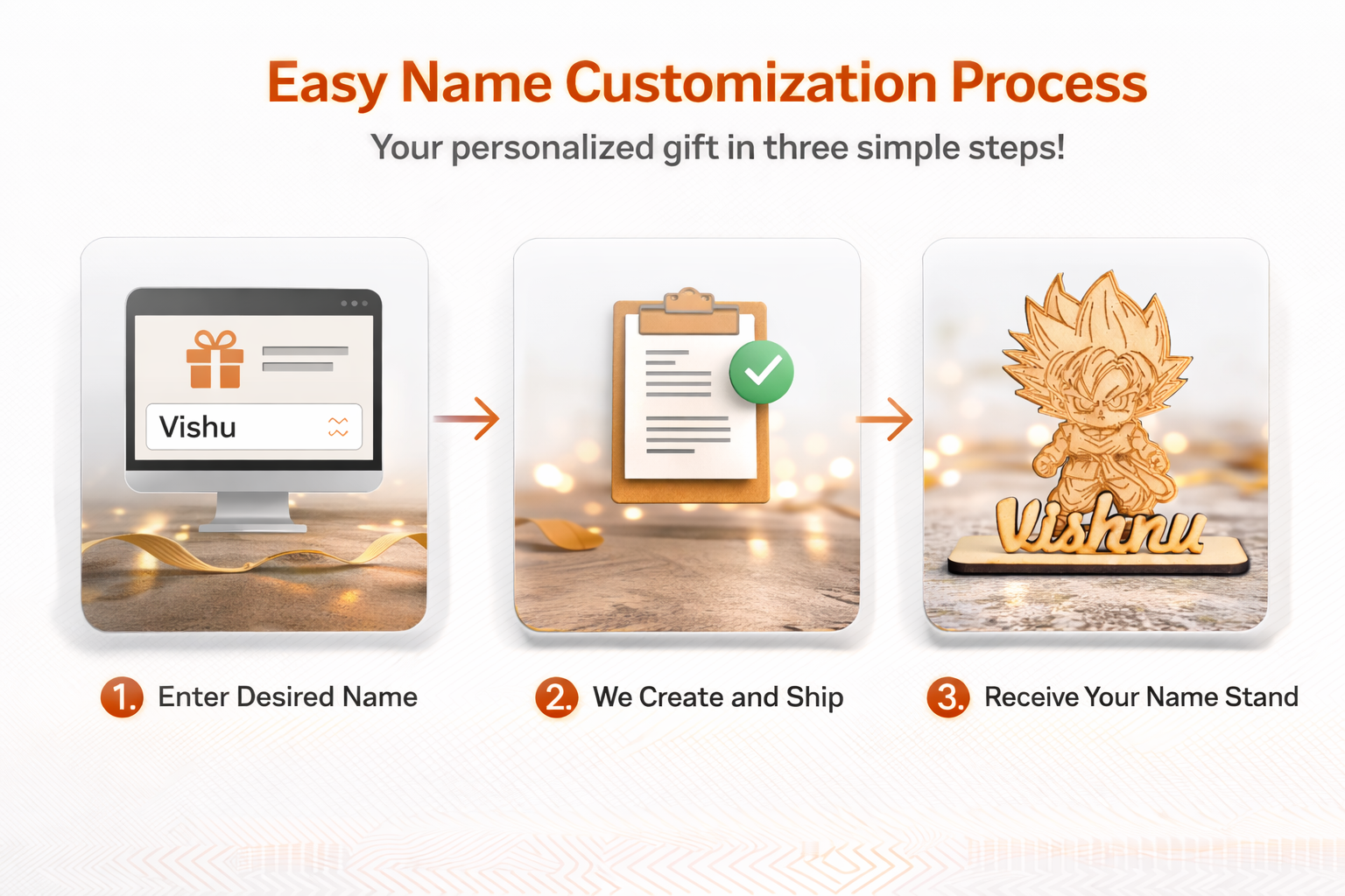 Make your workspace or gifting extra special with this personalized anime wooden name stand. Designed with a stylish laser-engraved anime character, this unique name plate adds a creative touch to any desk or room decor. Crafted from premium-quality wood, this customized name stand is durable, lightweight, and eco-friendly. You can personalize it with any name, making it a perfect gift for kids, anime fans, friends, and loved ones. Whether it's for a birthday, return gift, or desk decoration, this anime-themed wooden name stand is a thoughtful and eye-catching choice.