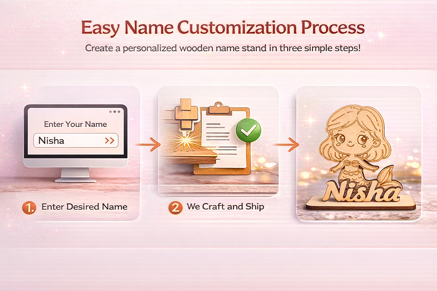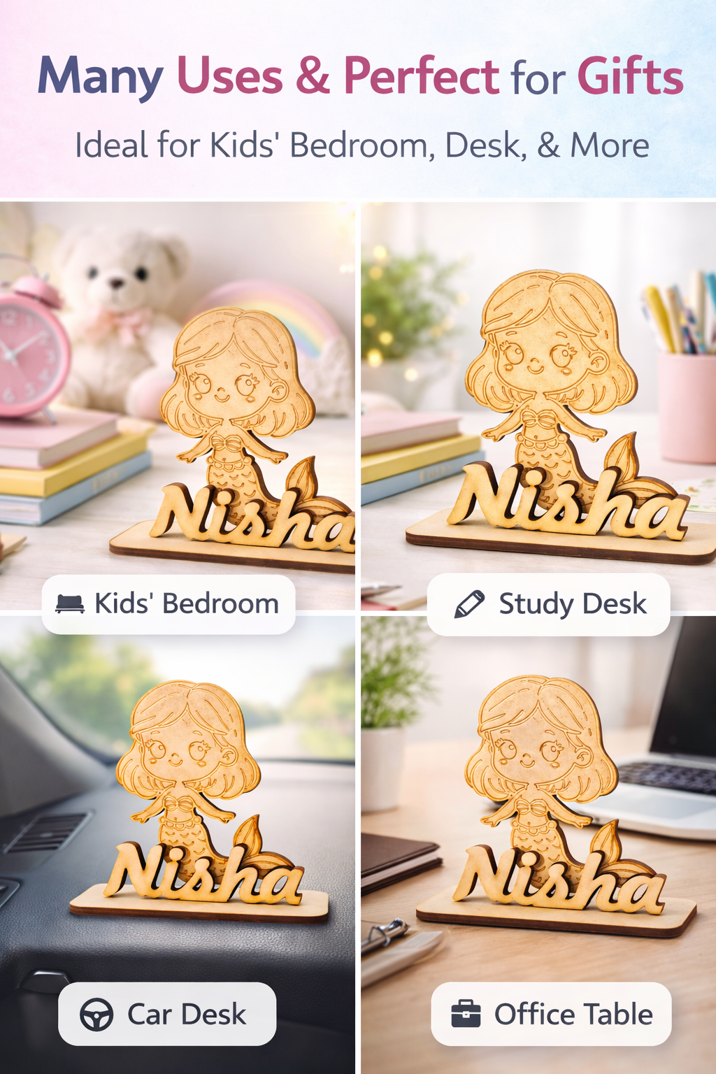 Crafted from high-quality MDF wood, this adorable cartoon-style mermaid standee is customized with your desired name, making it a perfect decorative piece for kids’ rooms, study tables, or shelves.